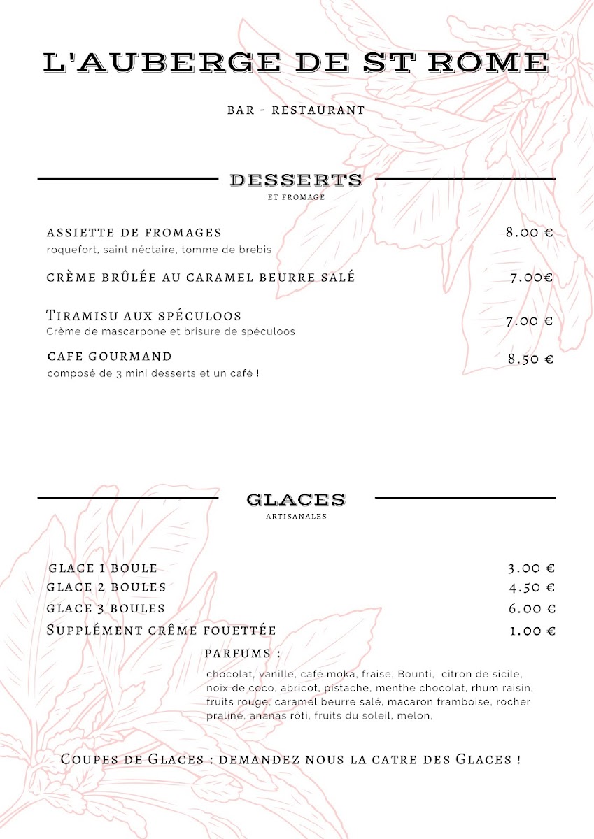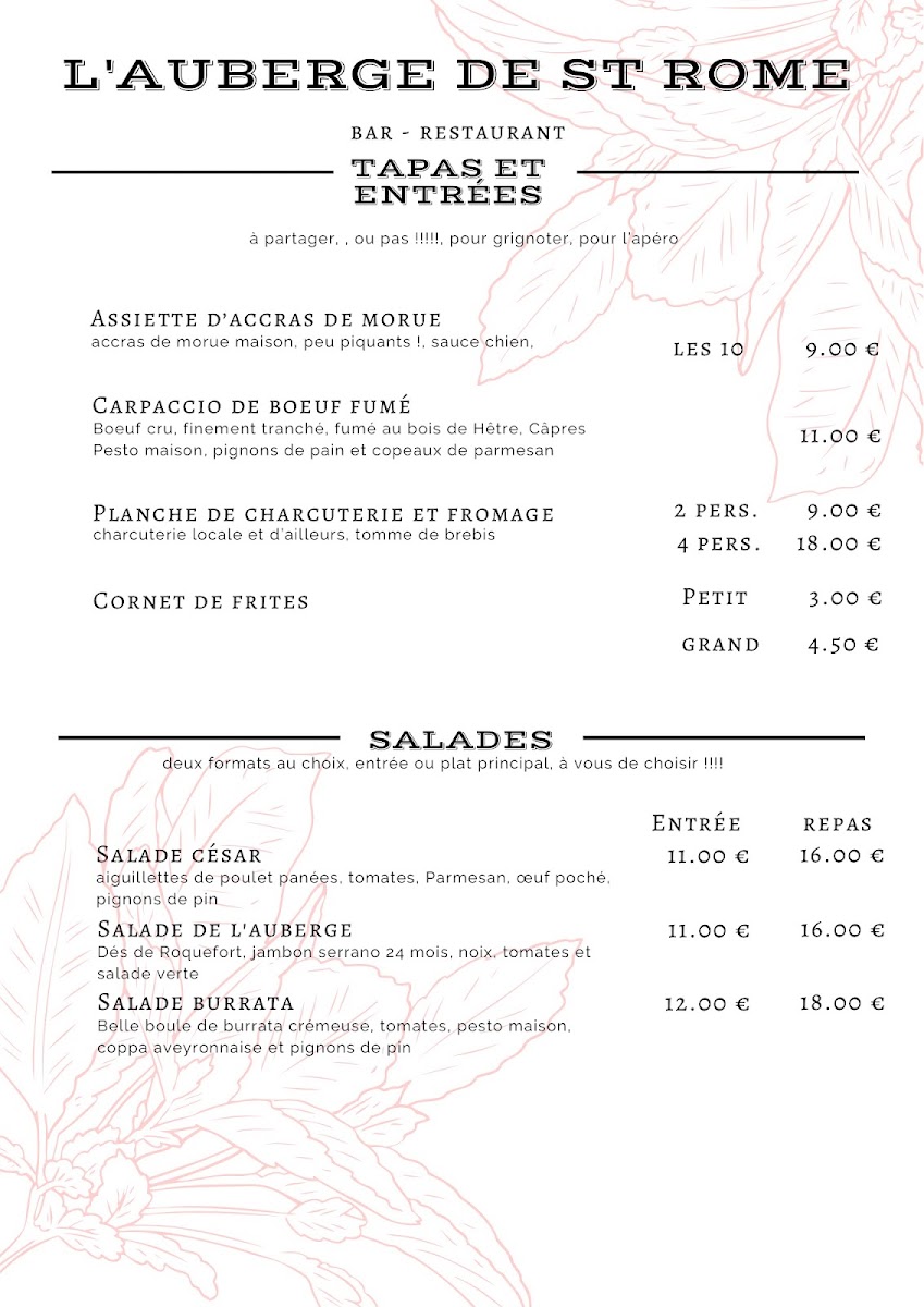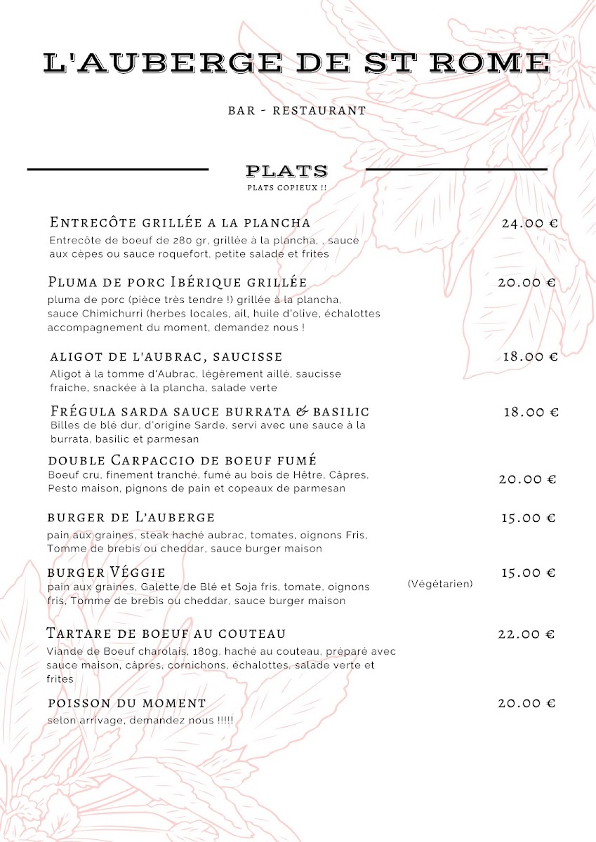 Welcome to Auberge de Saint Rome, a hidden gem nestled in the heart of Saint-Rome-de-Tarn. This charming auberge transports you to the rustic heart of France, where culinary delights meet warm hospitality. Our menu is a celebration of local flavors, showcasing seasonal ingredients that reflect the vibrant culinary landscape of the Tarn region.